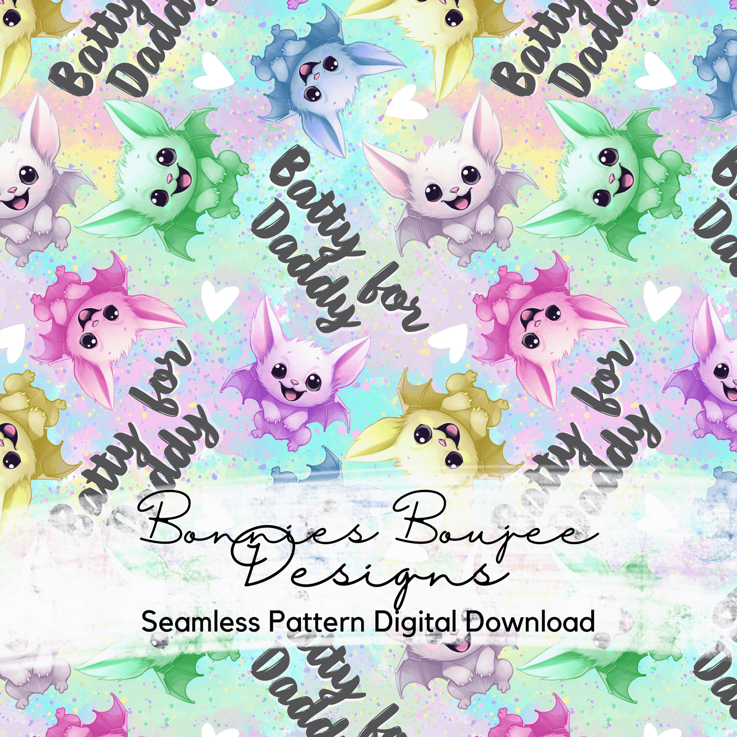 Get ready to go "batty for daddy" with our adorable "Pastel Bat Brigade" instant download! This seamless repeating pattern features cute pastel bats, along with the playful phrase "batty for daddy," creating a whimsical and charming backdrop for your creative projects. Embrace the seamless digital file and let these delightful bats add a touch of cuteness and fun to your designs, making every stitch or print a playful celebration of the special bond between bats and daddies!