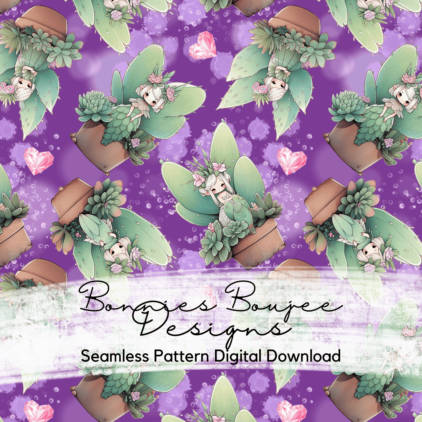 Step into a magical garden with our delightful instant download, featuring whimsical cartoon fairies frolicking among charming potted succulents! This seamless digital file offers a seamless repeating pattern, ready to add a touch of enchantment and greenery to your creative projects with a sprinkle of fairy magic and succulent cuteness in an instant.