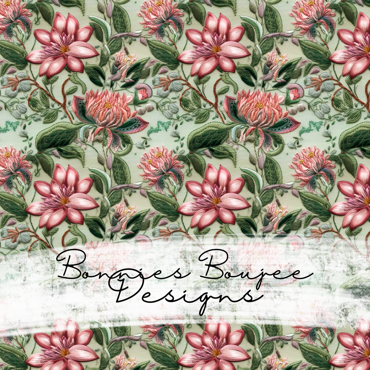 Embroidery of Pink Flowers with Green Foliage Seamless File