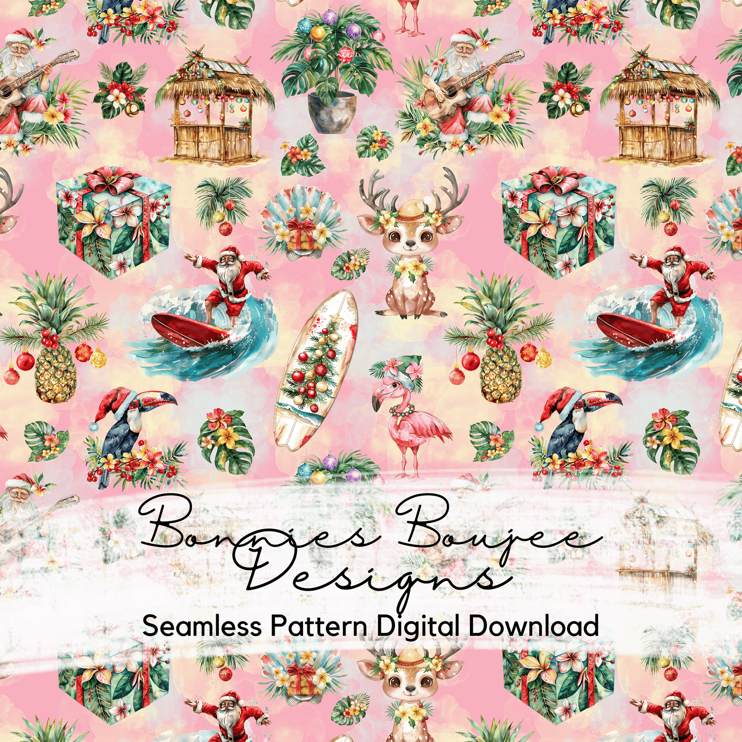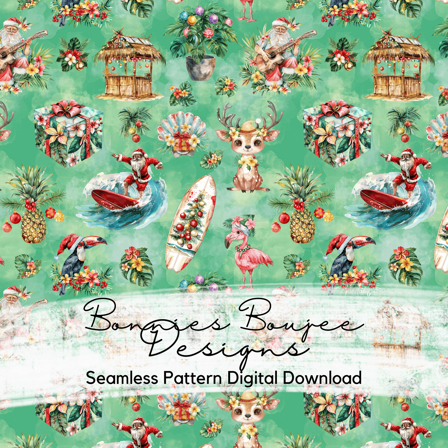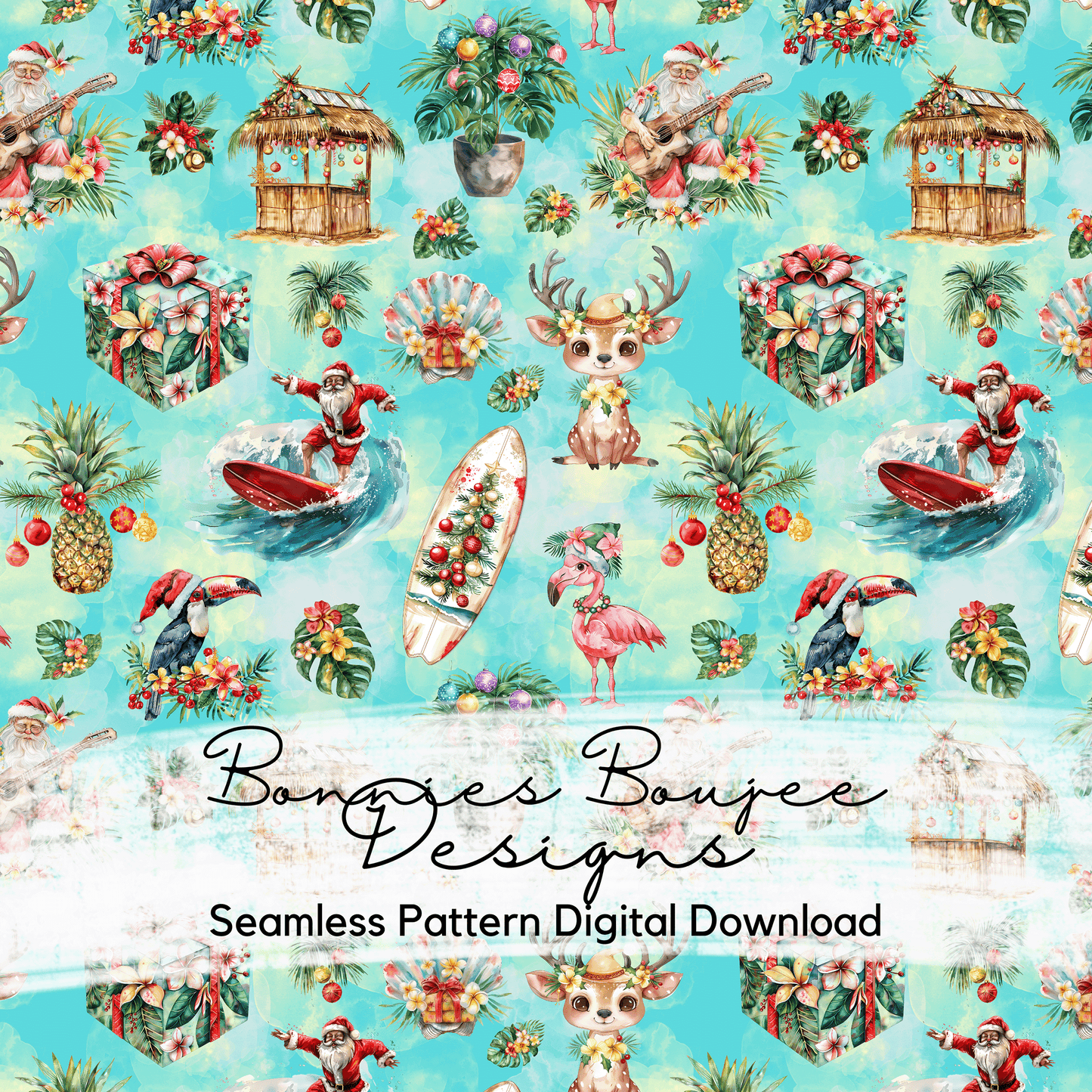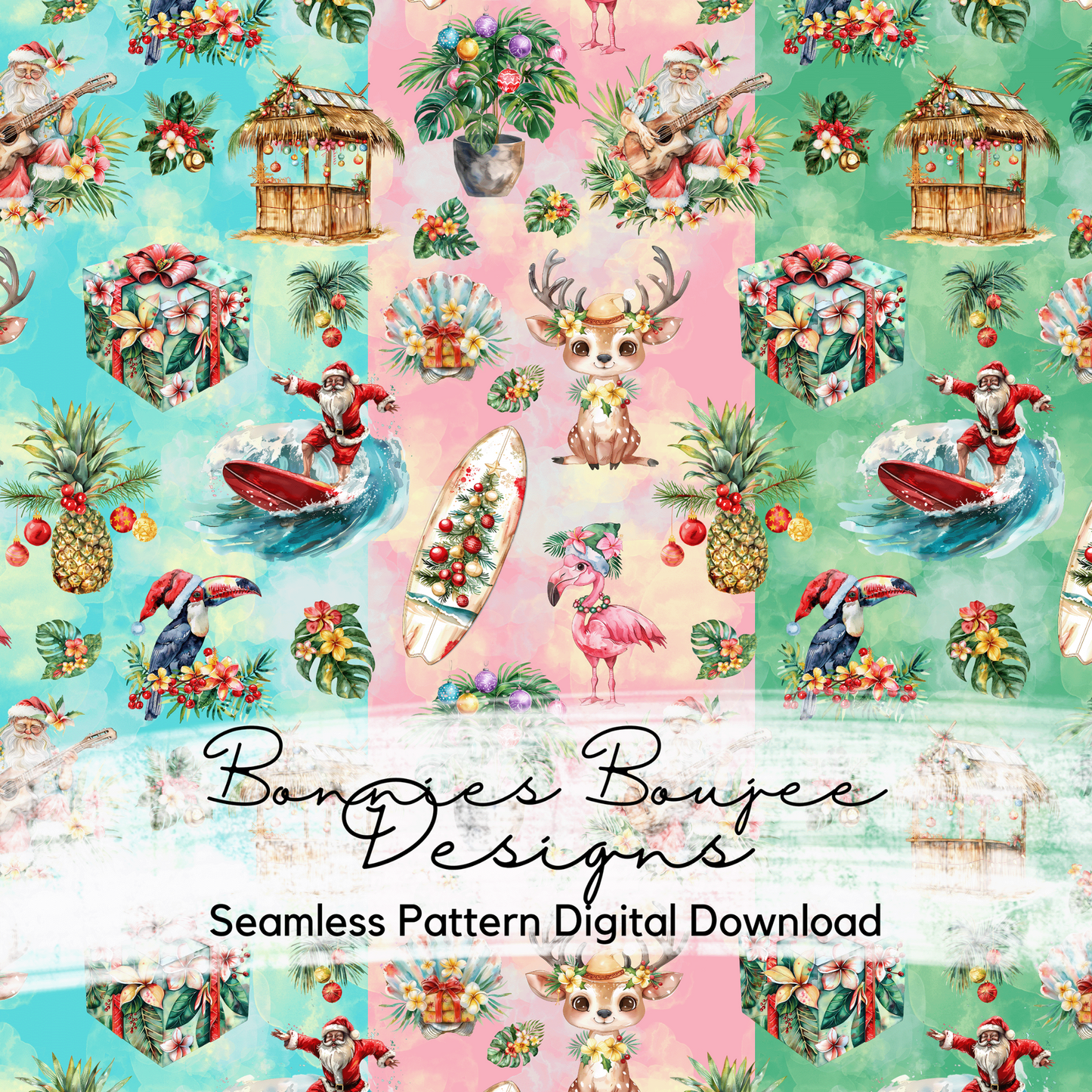 Holiday Surfing Santa Watercolor Style Seamless File with Three Colorway