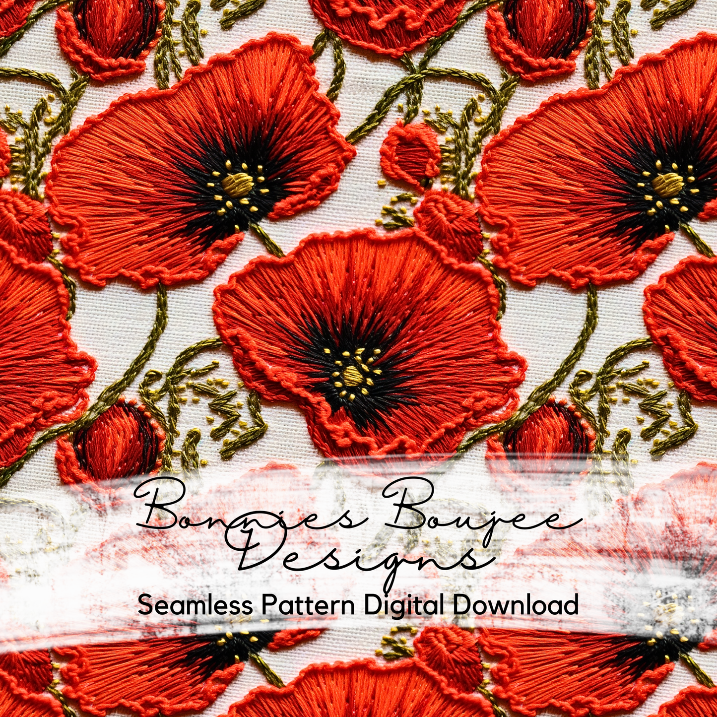 Embrace the beauty of blooming flowers with our "Embroidered Poppy Party" instant download, where a faux embroidery design showcases vibrant poppy flowers in a playful and captivating pattern! This seamless repeating print is perfect for adding a touch of floral charm to your creative projects, as the poppies dance across the fabric with whimsy and delight. Embrace the seamless digital file and let this stunning design inspire your imagination, making every stitch and print a joyful celebration of nature's colorful masterpiece!